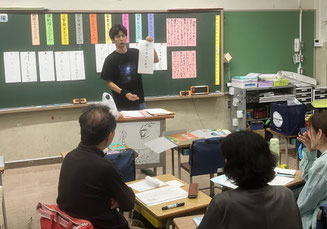 この(       )に入る言葉は何かを当てるのです。そして、それを当てるために、『放課後の時間割』のある章のプリントが配られました。このプリントから(この学校の夜警員)がわかります。さらにこの文章を読んで、このタイトルをグループで話し合います。これをやっていくとこの話の中に入っていきます。グループからの発表では「手の中のもの、なあんだ?」「これなんだ?」「菜の花」「井上さんの困惑」などが出ました。(『放課後の時間割』では「手の中のもの、なあんだ?」)今回のアニマシオンはやってみるととても面白いし、文章をじっくり読んで考えます。何より岡田淳さんの作品を読みたくなります。児童文学作家岡田淳さんの作品へ誘う見事なアニマシオンだと思いました。名鏡さんが取り組んだ4年生の作品が発表されましたが、「手の中のひみつ」など4年生とは思えないセンスあるものでした。この4年生の授業では「帯づくり」や「ポップづくり」にも取り組んだということです。素晴らしい!!(記録:笠井)